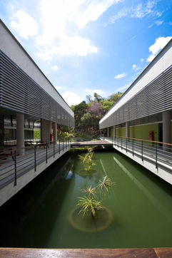 ”Inhotim es un sitio único que ofrece un amplio conjunto de obras de arte, expuestas al aire libre y en galerías temporales y permanentes, todas ubicadas dentro de un Jardín Botánico de extraordinaria belleza. El paisajismo fue inspirado originalmente por el famoso arquitecto y paisajista Roberto Burle Marx (1909-1994), y especies de plantas raras se distribuyen de manera estéticamente agradable en una finca que también cuenta con cinco lagos y un área forestal preservada. El Instituto Inhotim, decretado Organización de la Sociedad Civil de Interés Público, ofrece, además de estas áreas de disfrute artístico y entretenimiento - que lo distinguen entre instituciones similares - desarrolla trabajos de investigación ambiental, acciones educativas y un importante programa de inclusión social y ciudadanía. para la población local”. (www.inhotim.org.br) El Centro Educativo Burle Marx fue construido para albergar adecuadamente todas las actividades educativas desarrolladas en Inhotim. Alberga un espacio de recepción con cafetería, biblioteca, talleres y auditorio. Al edificio se le destinó un pequeño solar cerca de la entrada. El espacio limitado disponible y el deseo de imitar el edificio en el paisaje existente sugirieron el diseño de un pabellón horizontal, en un solo nivel sobre el lago, ligeramente hundido en relación con los alrededores.