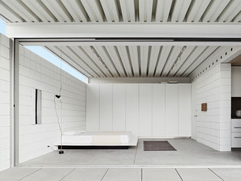 Respetuoso con su antiguo sitio, Desert One se asienta con ligereza en el suelo, tanto visual como sosteniblemente. La casa utiliza paneles solares para compensar en gran medida el consumo de energía. El núcleo es una unidad compacta que alberga todas las funciones mecánicas, de plomería y de cocina en un área pequeña. El aire se distribuye a través de orificios en las vigas de acero estructural y regresa a través de un techo de listones de madera en la cocina. Las paredes de bloques de concreto pintadas no requieren mantenimiento y no muestran los efectos del arenado estacional de los vientos del desierto. No hay paisajismo “vanidoso”: el sitio crudo y arenoso, dejado como ha estado durante milenios sin siquiera un camino pavimentado que altere la vegetación, no requiere agua. Los adoquines de hormigón de los dos patios se apoyan sobre pedestales ajustables; Una losa de hormigón inclinada debajo dirige el agua de lluvia al desierto circundante. Desert One fue diseñado para los extremos climáticos de su entorno (días de 118 grados, vientos de 50 millas por hora, lluvia que cae diez centímetros en una hora) y concebido como una respuesta a estas condiciones. Las características tomadas de este edificio para su aplicación en un contexto urbano incluyen: cómo crear privacidad y apertura dentro de un espacio contenido, cómo hacer que lo minimalista parezca y se sienta expansivo, cómo mantener la contextualidad mientras traspasa los límites e incorpora avances tecnológicos y ambientales, y cómo para conservar los recursos naturales. Con la privacidad suprema que ofrece el muro circundante, la casa da una nueva definición a la vida interior y exterior, invirtiendo la idea de la arquitectura de Palm Springs de los años 50, que trataba de la apertura como una extensión del paisaje circundante. Desert House tiene que ver con el cerramiento, con la apertura en el interior.